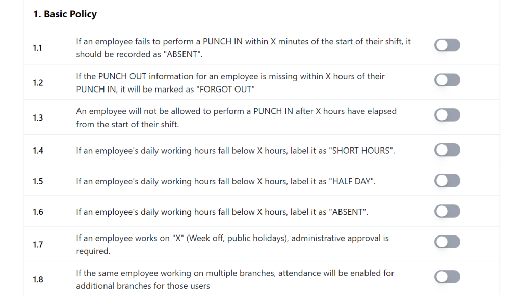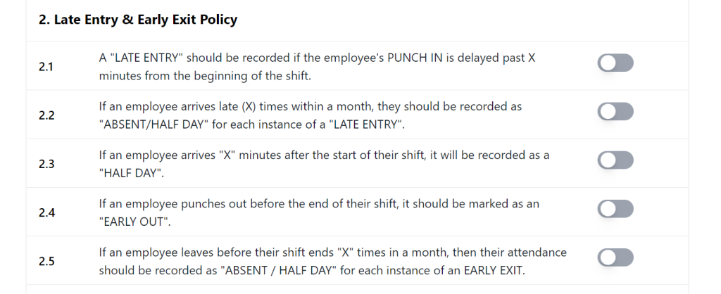 Individually set policies for late arrivals, early departures, half-working days, or partial sessions. Customize parameters like grace periods and deductions for different scenarios as needed.