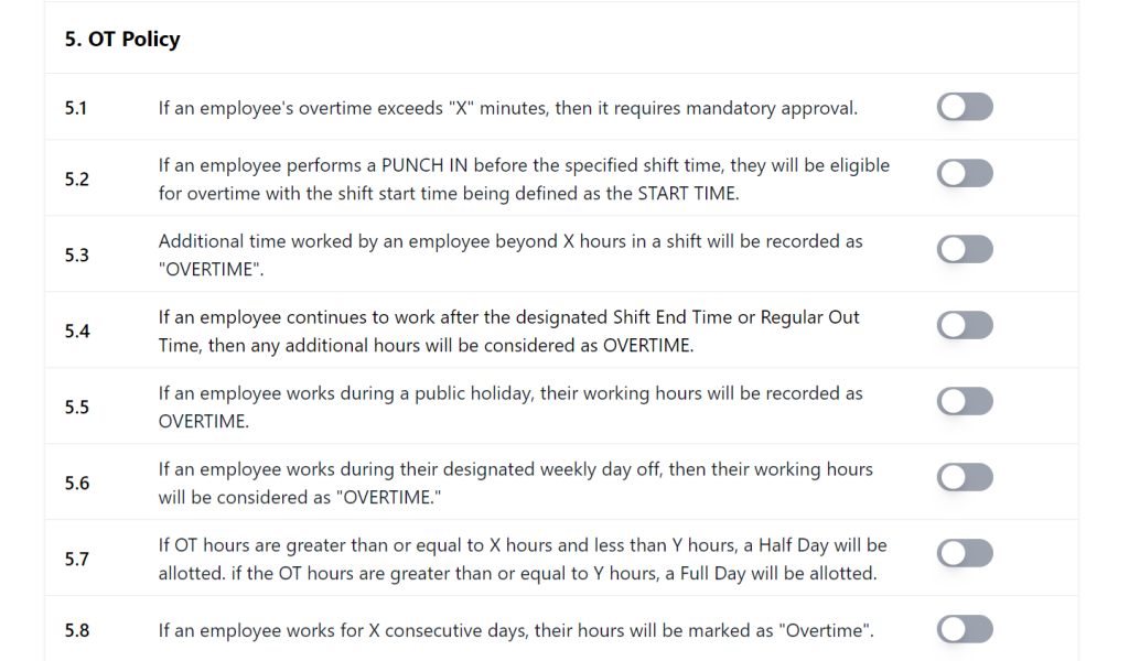Establish policies for minimum and maximum overtime and comp-off requests on both weekdays and non-working days. The software provides flexibility to customize policies based on employee categories or departments.