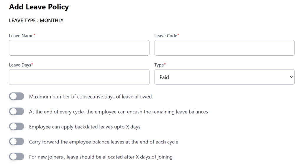 Generate and personalize leave policies, encompassing various leave categories. This functionality alleviates the administrative workload associated with overseeing employee leave allowances.